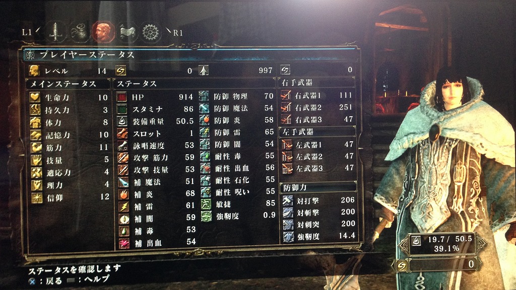 コメント/ ソウル の槍 ソウル 重量0% 装備重量60%+緑花草+緑花指輪2=装備重量0% 装備重量90%+緑花草+緑花指輪2+盾=装備重量60ダークソウル3 防具考察 ダークソウル3攻略日記 16, 08, 15 (Mon) 1040 COMMENT 今作における防具というのは過去作のように物理防御力ではなく物理カット率で表記しています。 この物理カット率というのが曲者でして正直どの程度防具により被ダメージ量ダークソウル2 適応力(敏捷)の検証結果 各所で議論を呼んでいた適応力こと敏捷の仕様について、ほぼ検証が完了致しました。 それでは、結果発表です。 (ジャカジャン! ) 敏捷の仕様 ・アイテムの使用硬直が短くなる ・ローリングの無敵時間が